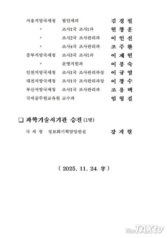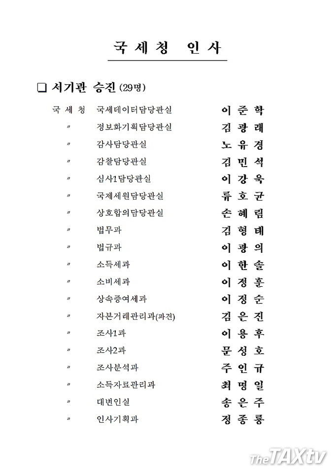 theTAX tv 채흥기 기자 | 국세청(청장 임광현)은 11월24일자 30명의 서기관 승진 인사를 단행했다.