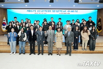 theTAX tv 채흥기 기자 | 한국세무사회(회장 구재이) 제6기 신규직원양성학교 수료식에서 36명의 교육생이 배출됐다. 지난 9월부터 2달간 교육을 받고 지난달 24일 서초동 한국세무사회관 6층 대강당에서 제6기 신규직원양성학교 수료식이 개최됐다. 제2기 졸업생 최영복 수료생은 “6기 수료생 여러분의 졸업을 진심으로 축하드린다”며 “여기서 배운 것은 시작에 불과하다. 세법은 계속 바뀌지만 큰 틀은 변하지 않는다. 어떤 사무실, 어떤 업계에서도 끊임없이 도전하길 바란다”고 응원의 메시지를 전했고, 우수상을 수상한 양승희 수료생은 “그동안의 노력이 좋은 평가로 이어져 기쁘다”며 “실무에 직접 활용할 수 있는 교육을 통해 현장 적응에 큰 도움이 됐으며, 배운 것을 바탕으로 맡은 일에 책임을 다하고 신뢰받는 세무 전문가로 성장하겠다”고 소감을 전했다. 문주현 수료생은 “두 달 동안 함께 노력한 동기들과 열정적인 강의로 이끌어주신 강사님, 세무사님들께 깊이 감사드리며, 교육을 시작할 때는 세무 지식에 막연한 두려움이 있었지만, 체계적인 강의와 실습을 통해 자신감을 얻을 수 있었다”고 소감을 밝혔다. 이어 “현직 세무사님들이 들려주신 생생한 실무 경험이 현장 적응에
